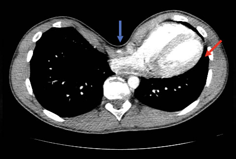 Chest CT showing significant sternal depression (blue arrow) of the heart and left lung (red arrow)