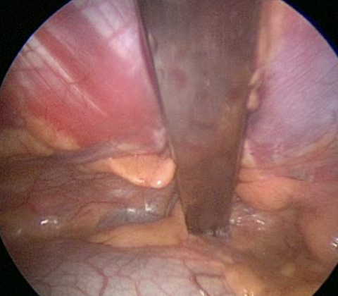 Intraoperative image of bar in place at deepest point of pectus excavatum lifting and correcting chest deformity