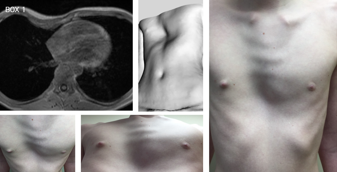A young boy with a mixed type of pectus deformity with a predominant pectus excavatum and right-sided mild carinatum and associated mild bilateral rib flaring. Before (Box 1) and after a Nuss procedure following bar removal (Box 2)