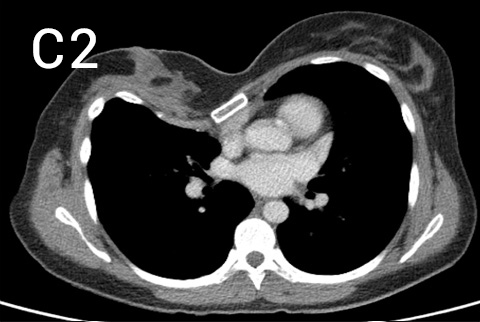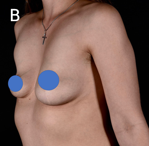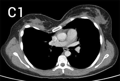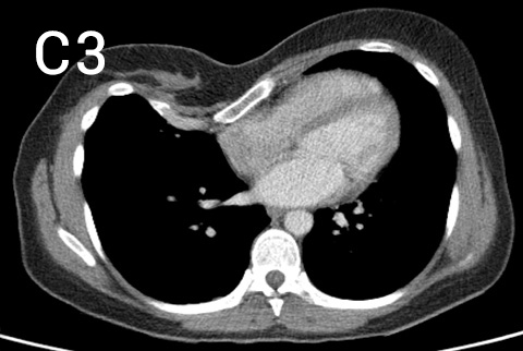 Pre-operative photos (A and B) with chest CT (C, multiple slices of upper (1), middle (2) and lower (3) chest) showing a long very asymmetrical pectus excavatum deformity in a 35 year old patient with striking symptoms of constrictive feeling in her chest